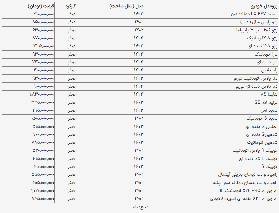 با مطالعه جدول زیر اطلاعات کاملی درباره قیمت روز خودروهای ایرانی در بازار به دست خواهید آورد.